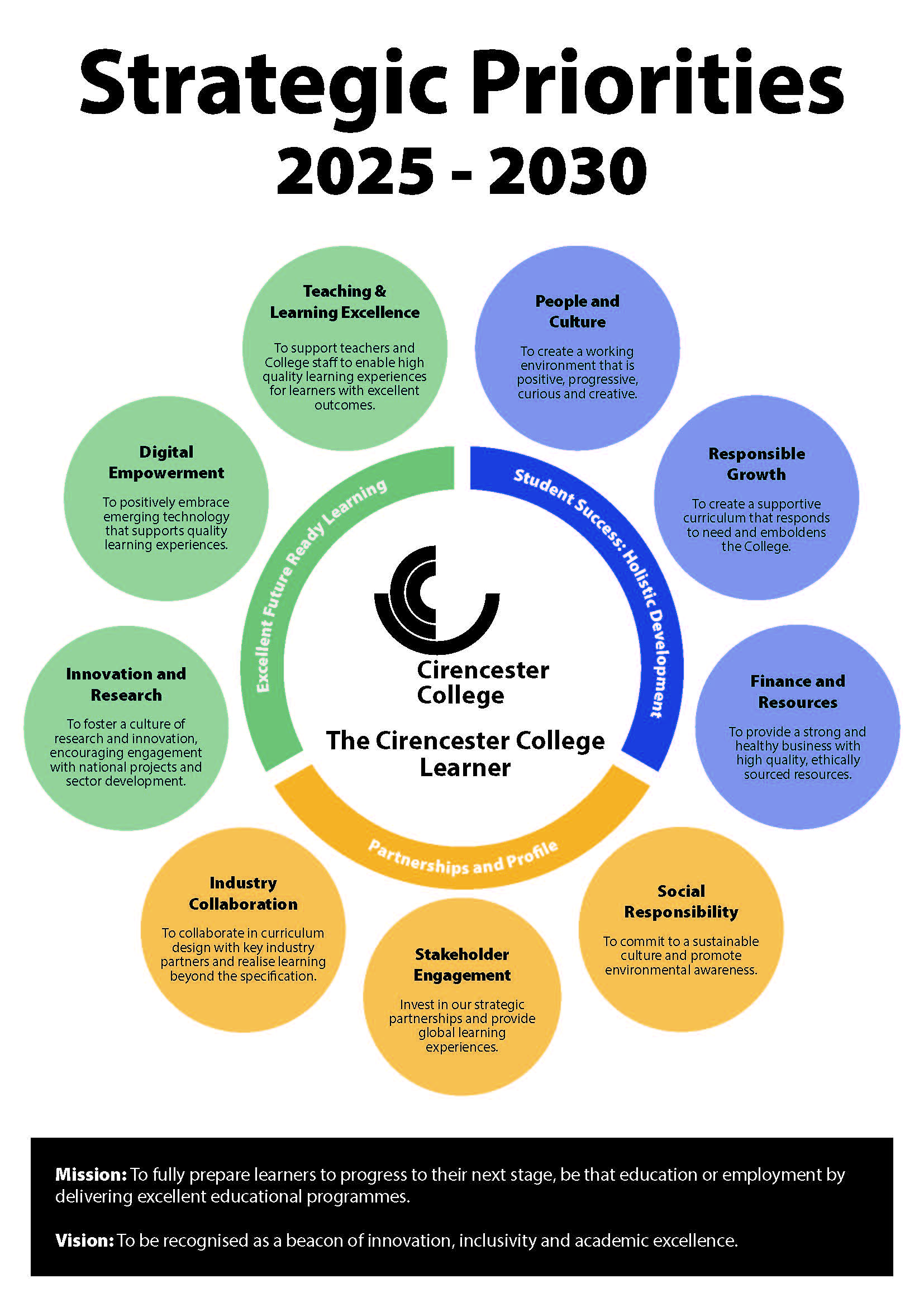 To achieve this we feel that there are two, fundamental principles, drawn from our mission, vision and values, that need to sit at the core of every decision made: being an outstanding college in every sense of the word and uniting all of the fragmented stakeholder groups into one, unique Cirencester College community.